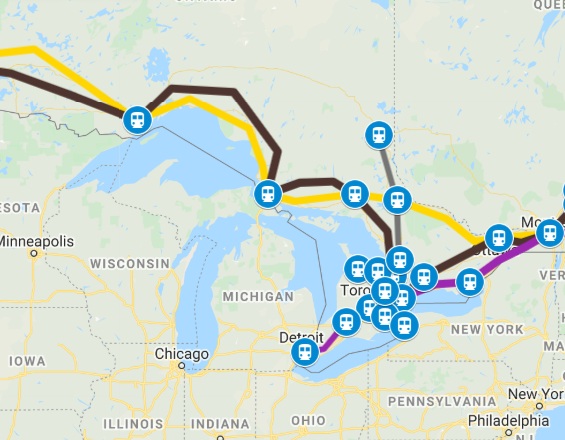I can only assume you are drawing a fantasy map, because in the Ontario and the Maritimes, at least, you have made corridors where no rail exists.