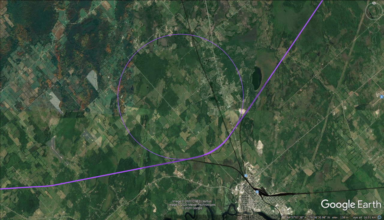 I extracted the routing from the excellent Ontario Railway Map Collection and only modified the relevant lines to cut them as required (and to make them meet each other at Agincourt). The only line I actually had to draw was the bypass northwest of Smiths Falls, for which I simply placed a circle with a radius of 3000 meters (i.e. sufficient to allow a maximum speed of 110 mph even with a total superelevation of only 2 inches, see next section), which touched the lines extended from the Smiths Falls and Belleville Subdivisions: