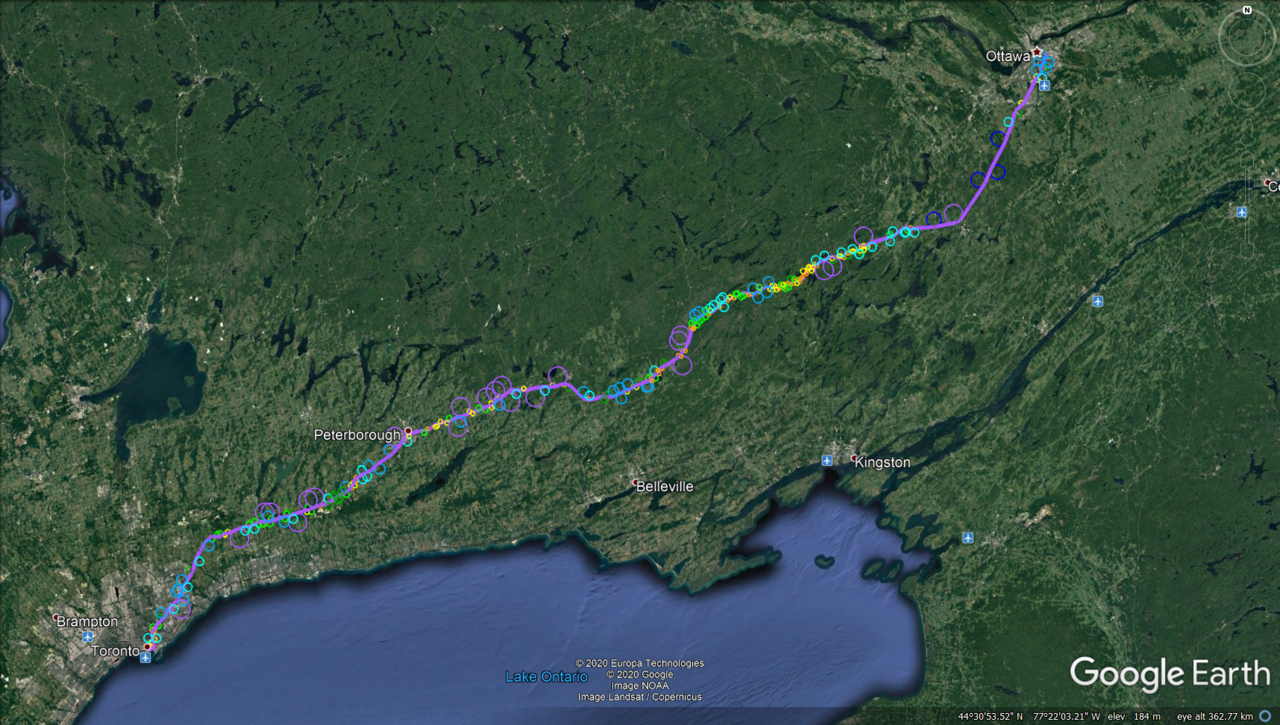 Let's move on to the tricky part, the curves: using the only perk of Google Earth Pro about which I care (i.e. the circle drawing tool), I have measured every single curve I could spot (by drawing tangent lines between those curves I could spot) - and believe me, there are a lot! Long story short, I identified 270 curves along the alignment, of which 229 were located on the Havelock Subdivision (thus 85%, despite only accounting for only 73% of the total distance: