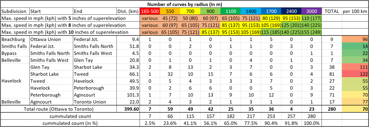 As you can see in above table, a superelevation of 5 inches only allows HFR trains to keep their top speed (assumed at 110 mph) in curves of the highest category (i.e. a radius of 3000 meters), which means that more than 90% of all curves require the train to slow down and that means in the case of just under 80% of all curves to slow down below 76.4 mph (i.e. the average speed which is required to achieve a travel time of exactly 3:15 hours between Ottawa and Toronto). Conversely, with a superelevation of 10 inches, HFR trains could also keep their top speed in curves with a radius of 2400 or 1700 meters and would only have to slow down in just under 80% of all curves and below the 76.4 mph in only just over 40% of all curves.