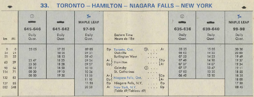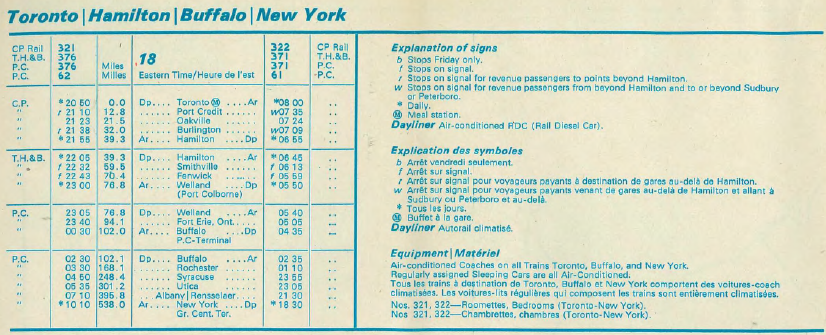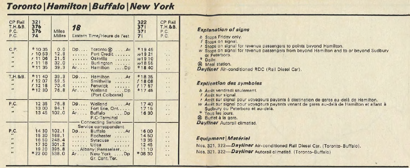 However, these through services were withdrawn in 1961 (Cleveland), 1962 (Pittsburgh), 1964 (Boston) and finally in October 1970 (New York City), when the last remaining train (an overnight train with coaches and sleepers to NYC) was replaced by the same RDC daytime service (Toronto<=>Buffalo) which VIA inherited in 1977 and terminated in September 1980: