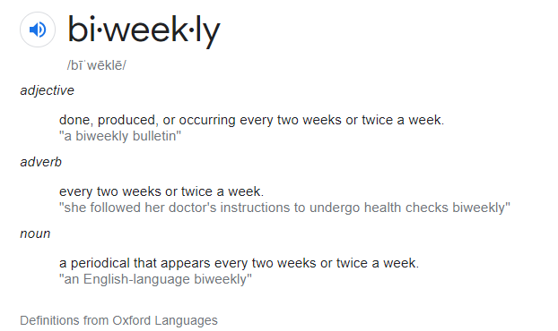 In a Canadian dictionary.Where do you get that bi-weekly means twice a week in Canada?