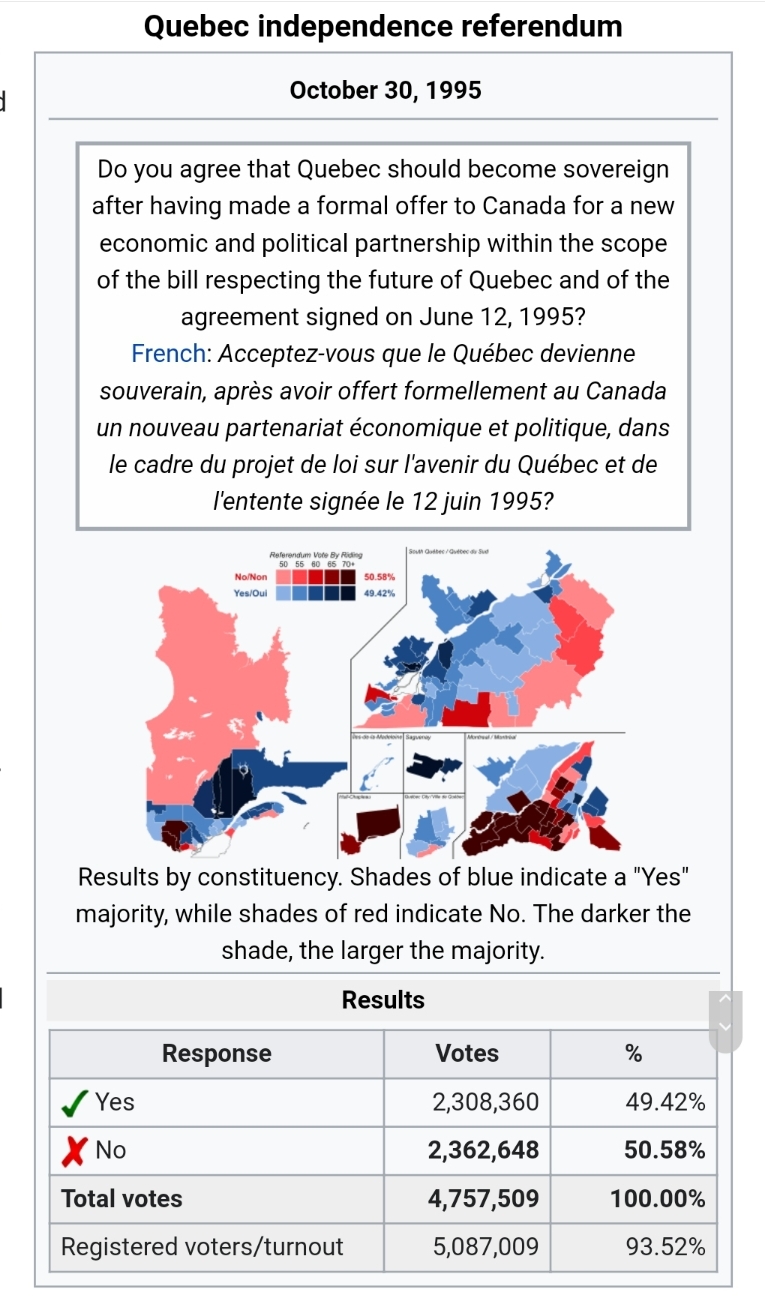 What the pro-sovereignty portions of the Quebec press wrote back then was that the majority of Francophone Quebecers voted to separate, which was true. That strong no votes by the anglophone and immigrant communities led to the that outcome. That said, those sentiments made many Quebecers feel unwelcome and second-class and were ill-considered.