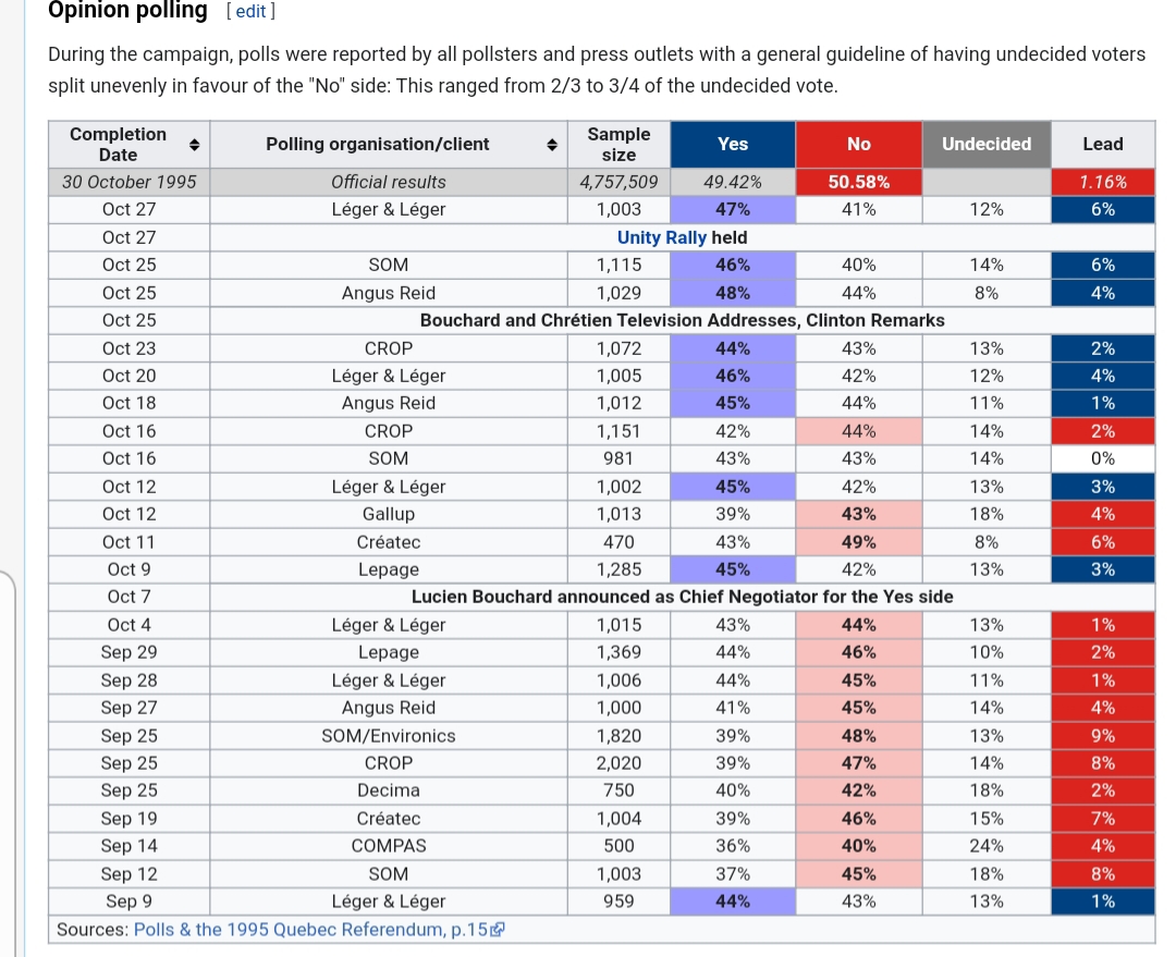 In fact, these were the final polls before the referendum, of which many showed a relative majority for independence, even though none indicated an absolute majority for either side: