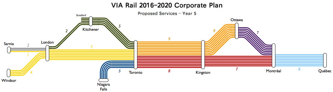 It is somewhat disconcerting how much of the expansion between Year 1 and Year 5 is in short-haul trips to Toronto from Stratford or Niagara Falls. These routes directly compete with GO's expansion plans - a competition they will lose due to VIA's variable-price tickets that need to be purchased in advance. I think that VIA should focus on its area of specialty, which is fast and comfortable intercity service. So rather than adding a bunch of short trips to Stratford and Niagara Falls, they should add a smaller number of longer trips to London, Windsor and Sarnia.