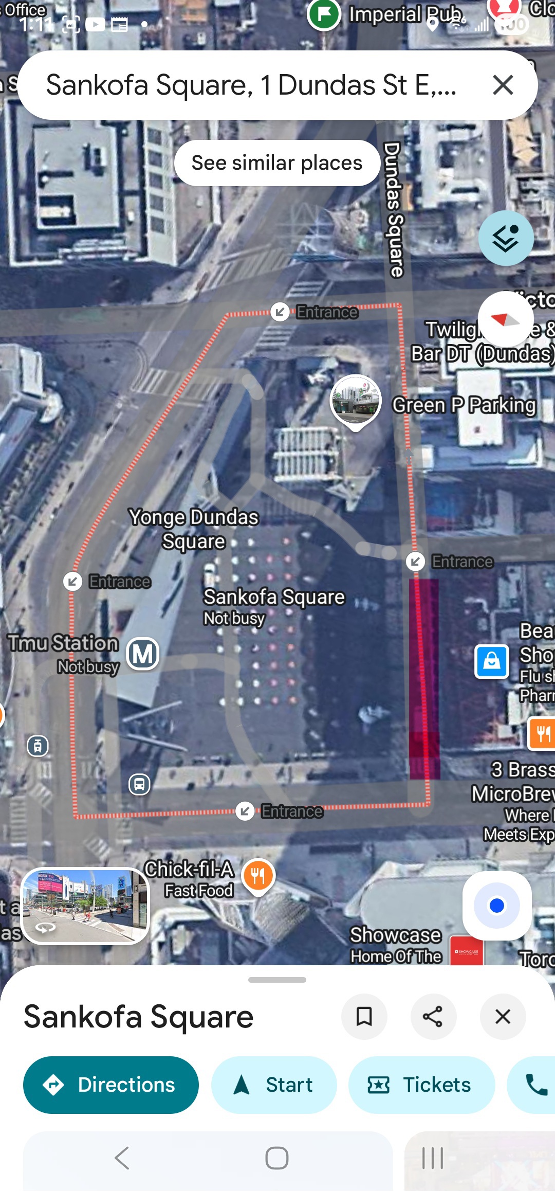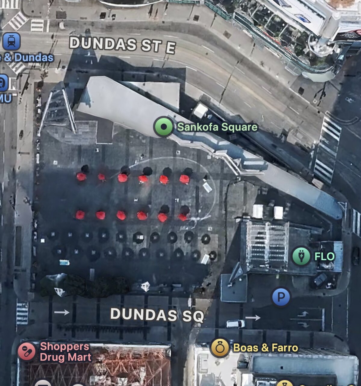 There are likely many small & large ways the square could be made better. My ideal fix (ideal ≠ realistic) would involve removing the highlighted pink part of the road in the satellite screenshot below in order to make it part of the square. The parking lot entrance could still be accessed from the back (Victoria or O'Keefe), but this way, at least one business and the eastern sidewalk could "spill" into the square instead of it being cut-off on all sides. Then, freely moveable tables & chairs could be placed there like at Love Park. Previously, I liked the idea of the Shopper's being replaced by a cafe, but with our silly Canadian rules that would likely mean it would have to be enclosed, so now I'm thinking free square sitting would be nice as one could get their food from anywhere to enjoy that space.